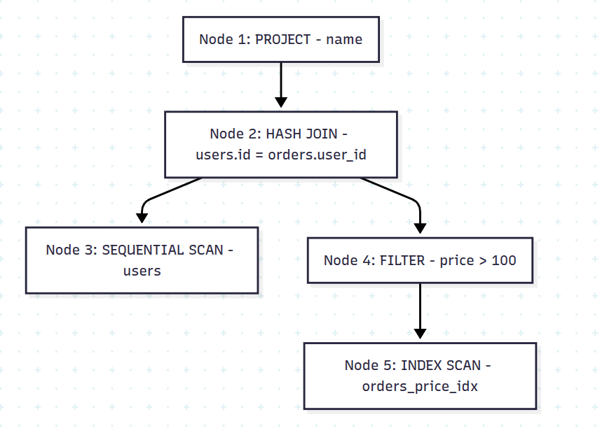 WHERE orders.price > 100;Sau khi tính toán các chỉ số về chi phí (Cost), Optimizer sẽ "vẽ" ra một cái cây kế hoạch vật lý (Physical Plan Tree) trông như thế này: