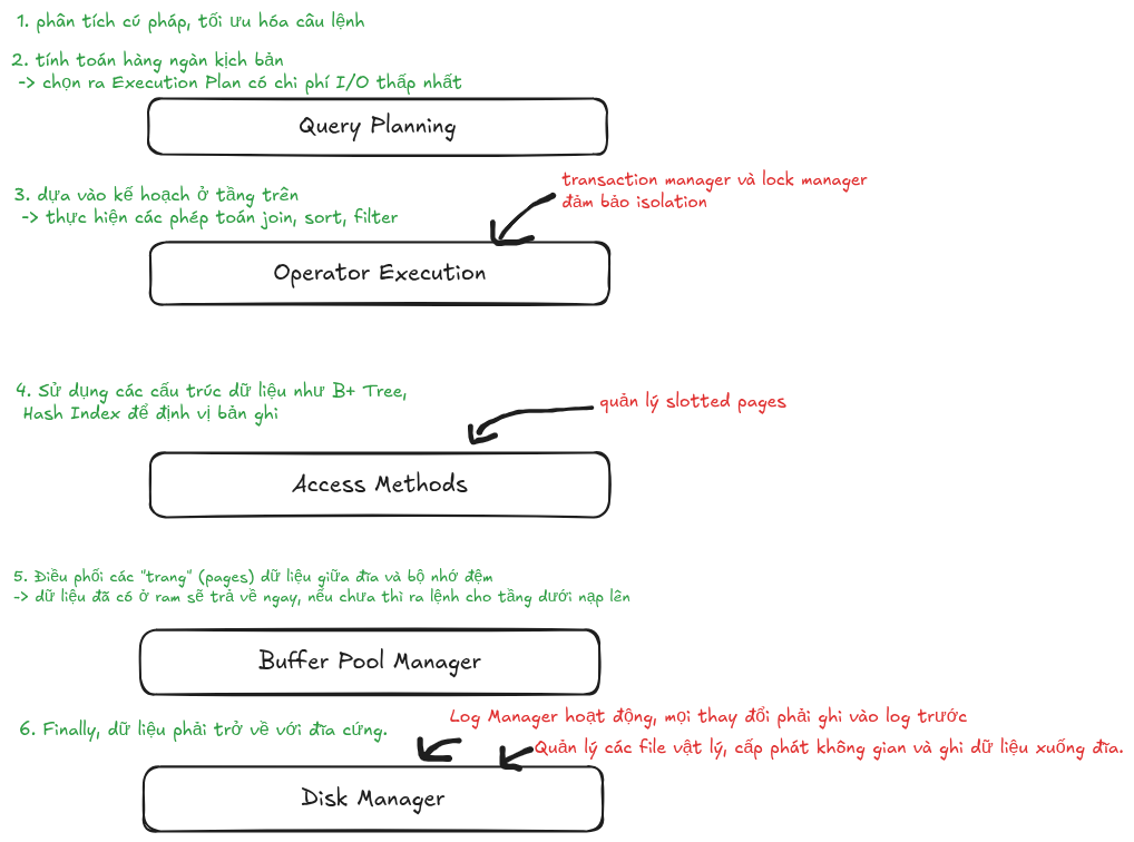 Chúng ta sẽ cùng đi sâu vào từng lớp kiến trúc của DBMS theo hướng Top-Down (Từ cao xuống thấp) — bắt đầu từ tầng xử lý logic cho đến nơi dữ liệu thực sự nằm trên đĩa cứng.